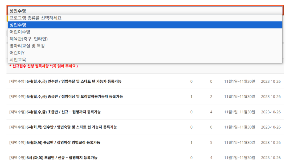 3. 빨간 테두리의 검색란을 클릭 하시면 '성인수영'