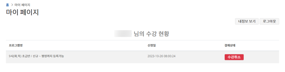 5. 신청에 성공하셨다면 홈페이지 상단 마이페이지에